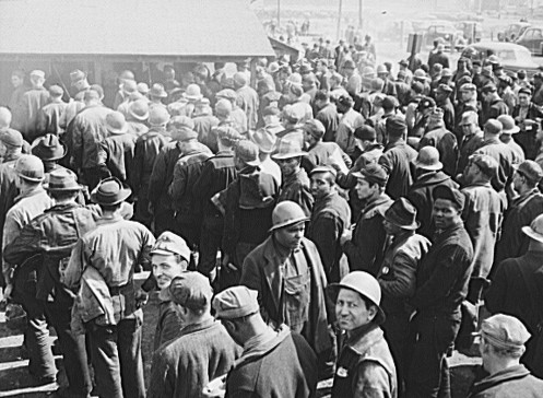 Workers in line to cash pay checks. Bethlehem-Fairfield