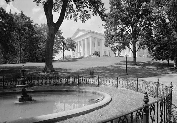 The Virginia State Capitol, conceived in 1785, is the second oldest working capitol in the United States. Designed by Thomas Jefferson while he was in France, the building was modelled after a Roman temple, the Maison Carree. While Jefferson did not directly copy the Maison Carree, but modified it to accommodate modern necessities, he did respect the general temple form and introduced the Classical Revival style into America. A half a century after the erection of the building, the General Assembly commissioned Maximilian Godefroy to develop a landscaping plan that would supply an appropriate setting for the public building. The formal French layout that resulted was drastically transformed in 1850 by John Notman who turned Capitol Square into the first picturesque park in America.